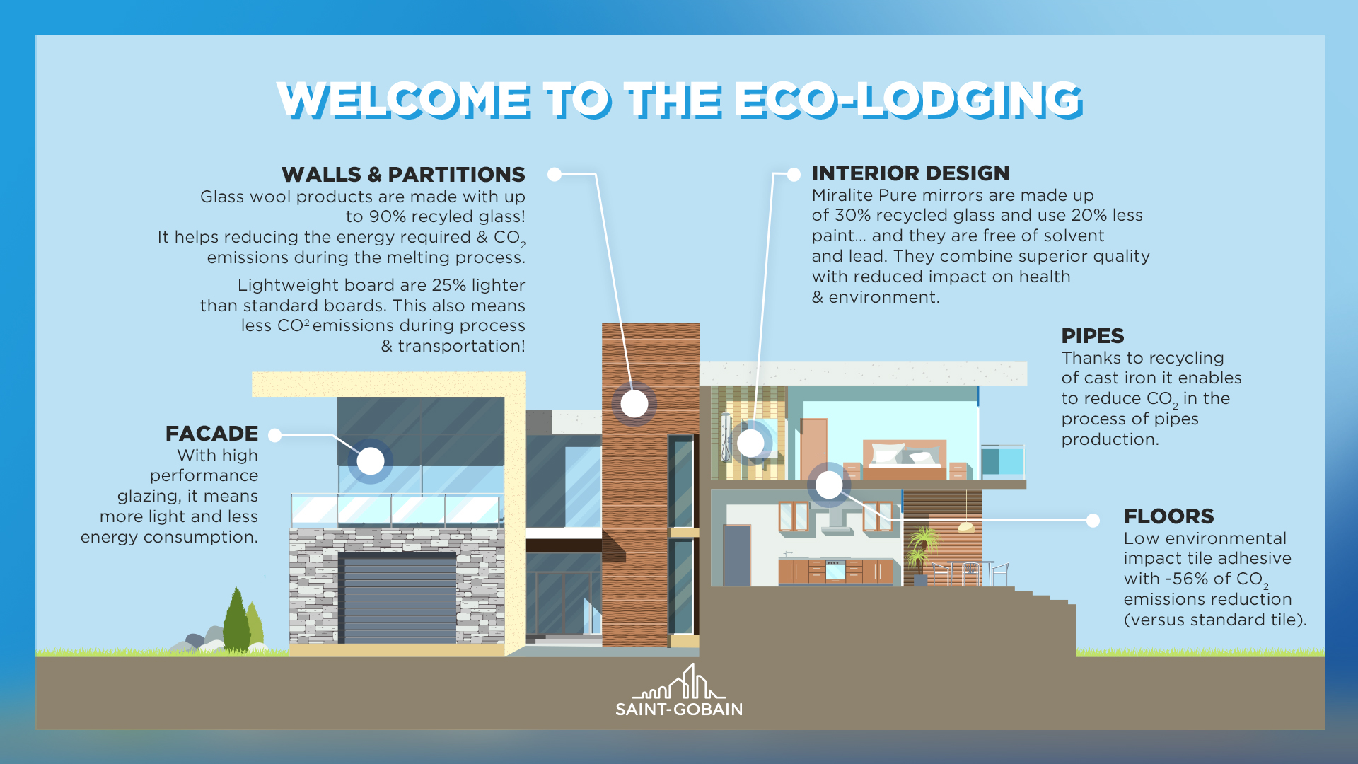 And Saint-Gobain lacks none of the agility or audacity to imagine new solutions: heated glass, magnetic plaster (British Gypsum), eco-friendly adhesive mortar, variable-tint electrochromic glazing and wall cladding that optimises air quality (Novelio CleanAir)!